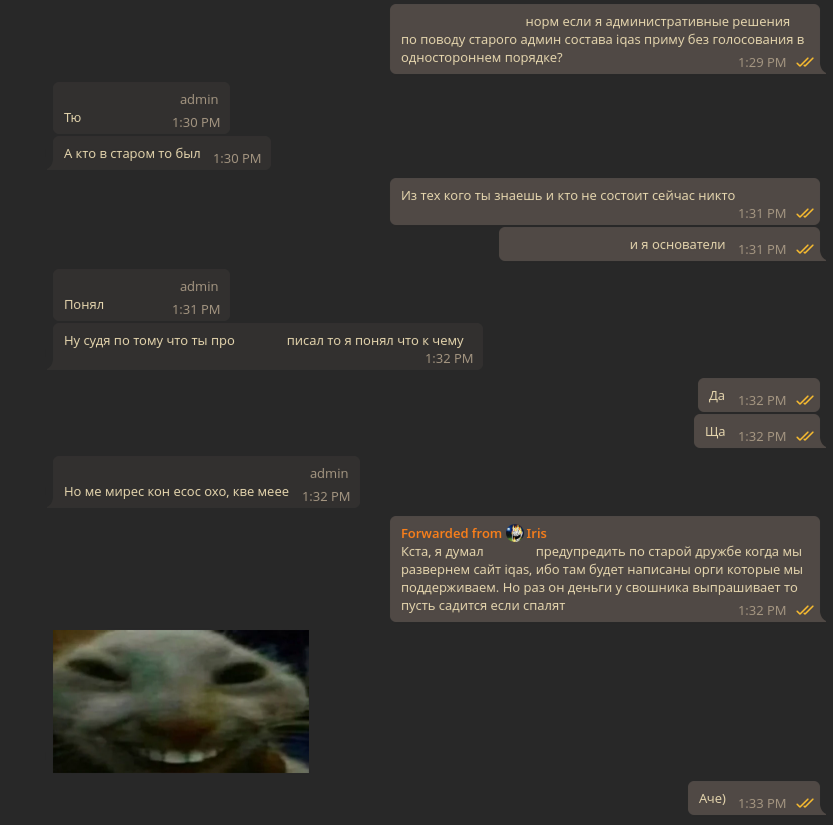 On 02.02.26 Iris has passed down the vote to ease up the voting regulations pertaining to the old administration of IQAS. This has been done due to the fact that Iris remains the last founder and therefore is better equipped to deal with decision pertaining to the old administration. This has also been done to avoid unnecessary bureaucracy, since realistically any such decision will not have a great impact on the organization.